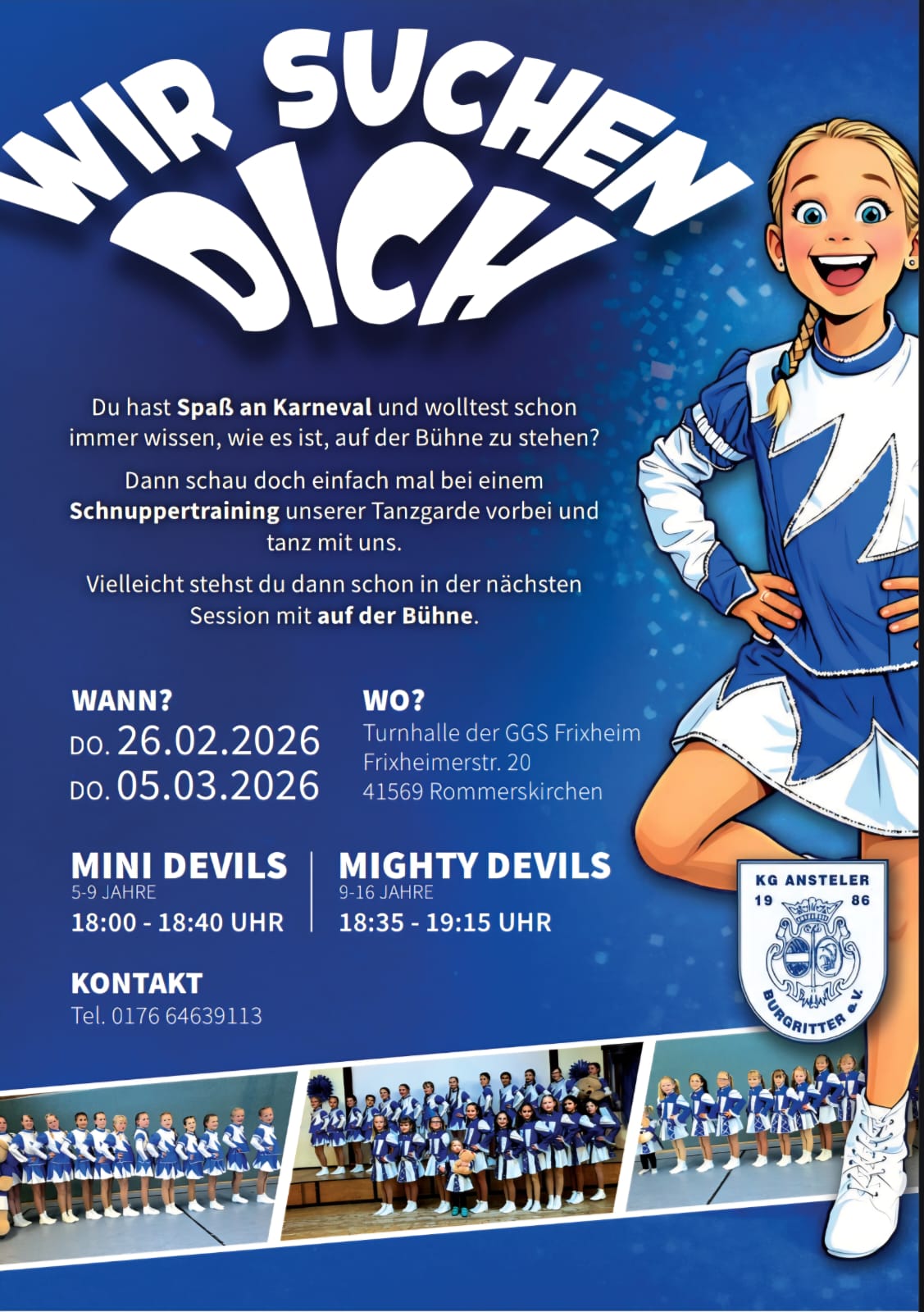 Willkommen bei den Ansteler Burgrittern ⚔️ Tanzen ist deine Leidenschaft? - Dann komm gerne zum Probetrainung vorbei. Wir können immer Nachwuchs, egal ob Junge oder Mädchen, gebrauchen. Mehr Informationen dazu findet ihr hier.